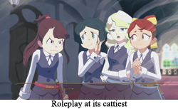 In another “this happened when you weren’t looking” plot, Akko and her schoolmates become trapped by The Chamber of Time, and wind up in an endless Groundhog’s Day time loop that threatens to make the first day of summer vacation infinite. While the day repeats continuously, our heroines find ways to travel to other regions and investigate the mystery of why anyone would ever watch this Endless Eight. Eventually, it is revealed to all be a sort of accident of a magical spell that a previous semester’s lonely and untalented student set in motion, and, conveniently, she transformed into a monster so you can punch this problem until it goes away.