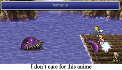 All that said, I come back now to praise the opera. I love the Ultros segment. I love that they set up this whole silly scenario to “trap” Setzer who has already made it known that he is going to interrupt the proceedings, and, somehow, a malevolent octopus gets involved to further muddy the waters. So rarely do stories have the guts to just throw a bunch of random events together into the complete chaos that ensues. Does Setzer even notice that things have gone horribly awry while he is kidnapping “Maria”? If Ultros was successful, and everyone had to spend the rest of the night scraping Celes chunks off the stage, would Setzer kidnap the real Maria some other night? Are the rats in the rafters Ultros minions, or does this opera house have a serious problem with man-sized rodents? Everything ramps up to eleven immediately after the “serious” opera, and I sometimes wonder if that was the “point”. Final Fantasy 6 generally takes itself seriously, and the fact that you can “fail” the opera while playing as Celes tells me that the producers wanted you to pay attention for a serious opera here. But maybe that’s a feint? Maybe the seriousness is all setup for the punchline of Locke and Ultros becoming impromptu stars at the last minute? Whatever! All I know is that BBQing octopi on the main stage is a highlight.