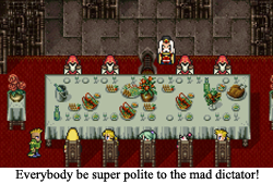 Recall “The Emperor’s Feast”. Something I always remember more fondly than the Opera is the bit after the Espers wreck Vector, and the Returners are invited to a dinner with Emperor Gestahl. This is fun and unprecedented in an RPG of the time, because, prior to Final Fantasy 6, if you had a problem with the evil emperor, you hit him with swords until he became a God of Hell. The concept that you are going to have a diplomatic meeting with a warring country is great, particularly when half your party seems to be kings and fallen kingdom survivors (And Gau. Don’t take him to dinner). The results of the dinner are organic with the plot (South Figaro and Doma are almost always liberated as a diplomatic showing of good faith), and you can even earn extra fun items if the Emperor “likes you” by the end. However, the whole sequence is super-duper videogame: before the dinner, you are asked to run around the castle and talk to soldiers, occasionally instigating fights. Once you are at dinner, you get a whole three questions in, and Gestahl asks if you want to take a break. If you take a breather, you can instigate another series of fights. And it’s a sign of the times that, basically, the producers only had full confidence that you were playing this game to engage with the (awesome) Final Fantasy battle system, and the idea of “talking” through an event was probably going to be ignored. This is in stark contrast to modern game design, where your average Persona title involves about seventeen hours of advancing conversations before your first battle, and dungeons are punctuated with opportunities to enjoy wannabe dating sims. Mind you, I’m just punching down to Persona again here, but Final Fantasy itself has gotten into a routine wherein you can go long swaths of game without what was considered “the game” back in 1994. And that wouldn’t be possible on the SNES just due to a lack of confidence that was earned here at the opera house. There is audience participation, and the timed battle event immediately thereafter, but the opera scenes are basically just “sit back and watch this part”, and that somehow became one of the most iconic parts of this game (if not the genre as a whole).