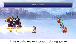 All of Sabin’s Blitzes used to be high risk, high reward affairs that praised a player for having muscle memory in an RPG. Choosing to “blitz” meant you had to memorize a motion sequence from a menu beforehand, properly recall said motion, and then actually perform that sequence with no immediate feedback. If you were successful, the attack would work. If you failed, you would waste a turn, and receive zero explanation of where you went wrong. This seemed “fair”, as many of the blitzes simulated magical attacks that always had an MP cost. Sabin gets to use his own version of Fira on the monsters, but only if he can properly recall/recite in the heat of battle. And if you are no good at “fighting game motions”, you have eleven (or so) other characters that do not require that skill. It is a surprisingly effective method of marrying Sabin’s “years of training” narrative to actual gameplay conventions. If you trained with Ryu, you can Aura Cannon, too.
