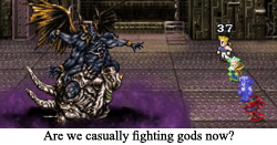 But… yeah, I think that’s where I’m going to end this. I could spend the next thousand words discussing the differences between Tonberry, Tonberries, and Master Tonberry, but… I think that’s just how Final Fantasy 6 is in my head. I understand why this game hit me so hard as a child: it is a good game (Gogo can customize his skills!) coupled with a story and concepts that could light my imagination aflame (Gogo is secretly Darill!). This is the game with the largest playable cast in mainline Final Fantasy history, and that seems apt: it is a gestalt of a bunch of weird little concepts and set pieces, and, while much of it is extremely shallow, it somehow unites into something more. When I was a toddler, I was excited to see the Voltron lions go-lion in a giant man with a blazing sword, and a decade later, I was excited to see how Strago, Locke, Mog, and Terra all combined into an amazing game.