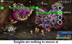 Despite the lovely cinematic moments being reproduced in Theatrhythm, jamming to this rhythm game is in no way a substitute for playing any of the games featured. The remarkable character designs have all been flattened out to nondescript mishmashes of hairstyles and armor pieces, the “battles” are little more than hammering two buttons and four directions, and even some of the featured songs are shadows of their former selves (give me my 17 minute Dancing Mad, monsters!). This is replaying a Final Fantasy game in the same way that scarfing down a Big Mac is eating a sirloin. But sometimes you feel like having a Big Mac. Sometimes you acknowledge that you don’t have the 100 hours you need to reexperience the Final Fantasy 13 trilogy (and… uh… the backwards compatible Xbox, too, because this one keeps dodging rereleases), and maybe listening to a collection of tunes and whacking a space pope is good enough. Sometimes you just want to be reminded of greatness in a new and exciting way.