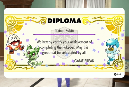 Of note: I did not realize you could earn prizes for gradually filling out the Pokédex, so when I wanted to earn my diploma, I had to sit through a lengthy awards presentation.