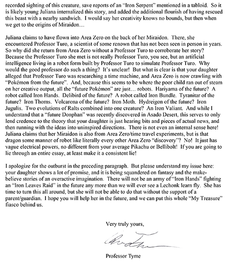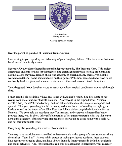 Today’s article generally spoils the whole of the (main, non-DLC) plot of Pokémon Violet/Scarlet. If that is something that would concern you, then you don’t have to look at any of today’s images. If you are perfectly okay with this, then open the following letter…
