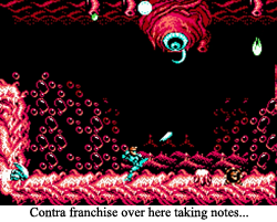 Is it related to Street Fighter? Alright, so Ken’s birthday was February 14, 1965 (noted on the character biography screens of the original release of Street Fighter 2), that means he would have plenty of time to become a 45-year-old scientist of some renown by the far-flung future of 2010. And it completely makes sense that some mutant cybernetics (or whatever) would bring him back to the fighting prowess of his Street Fighter 1, American Champion-self. So, hey, this could totally be Ken Masters from Street Fighter! And some of those “boss arenas” feel like future versions of street fighting stages/fights.