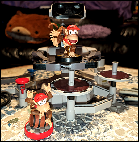 - Amiibo Corner: We have Link’s unfortunate yellow translucent pillar happening again, but Diddy’s Smash Amiibo is otherwise very fun. And he’s a funny monkey! It works! The action pose of leaping is cool, and he is very friend shaped. Mario-Diddy is hanging on a barrel and clapping along, which kind of makes him look like some capriciously active pet at a bar. Pretty sure that is not what Nintendo was going for…