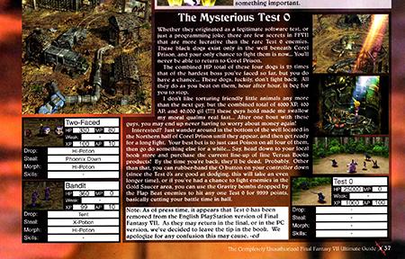 - Did you know? In the original Final Fantasy 7, Test 0 was a dog-type monster that could be found at the bottom of a well in Corel Prison. Its inclusion was likely an accident, as the creature could not attack, randomly said stock phrases, and had a disproportionate amount of HP. And it was removed from all later versions of Final Fantasy 7, including the American release. But some of us knew about it because the Versus Strategy Guide for FF7 apparently was based on an early build that included the creature: