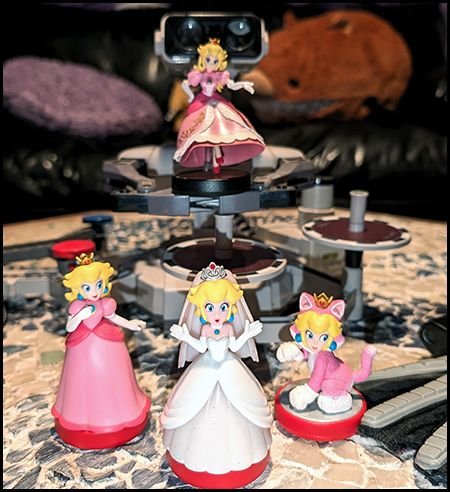 - Amiibo Corner: I’m seeing double! Four Peaches! Smash Peach is beckoning an opponent with zero waist and 90% dress. Party Peach may have had a lobotomy, and is matching Daisy as a sentient bell. Wedding Peach is meant to be between two other Amiibo, and otherwise just looks very confused and/or surprised to be here. My favorite is Cat Peach, as the costume has a lovely faux “material” that simulates pajamas. Princess Peach should be comfortable during at least one adventure.
