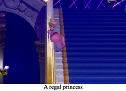 - Head canon corner: Is Peach ever in danger throughout this adventure? Considering she loses a “heart” for making improper deductions as Detective Peach, I am willing to state that “hearts” are not health in this game, but performance points. Get hit by too many kung-fu grapes or fall in too many pits, and the audience loses interest, and the play ends. Peach doesn’t die, she just has to rehearse again!
