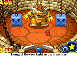 - An End: The final boss is Bowser, and you have to monkey with a pair of thwomps in the room to properly damage the big bad. This, once again, exemplifies everything wrong with this concept, as successfully bounding around the room to activate the “trap”, and then actually hitting Bowser while he is stunned is vaguely impossible half the time. And when you do not have a clear shot, there is literally nothing else to do in the room. And it all resets to the start if you fail. Awful. Just awful. Princess Peach can save herself.