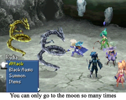 But Final Fantasy 4 (DS) makes some peculiar choices. It is built to be replayed repeatedly, but not infinitely! FF4DS contains a New Game+ that allows you to bring forward random items and skills through playthroughs. But you can only take it with you for a total of three playthroughs. Once you complete the game a third time, you may not restart with your acquired powers again, and if you want to “start over”, you are truly starting over from zero. And there are skills that can only be acquired through careful playthroughs! Much of the chicanery of the DS version is that you are supposed to give party members that you know are going to leave the party random skills, as you will then receive upgraded skills as a parting gift. And you might notice this on an initial playthrough, but you must notice it by about your second time through, or you are never going to see the coolest stuff before your loops are expended. This whole “limited New Game+” system is ostensibly there to rein in earning infinite skills and simply turning Zeromous to paste with two well-combined, maximum-powered commands, but… Can’t we have a little fun? Are we not entitled to some dragoon-tears-amplified death lasers in a universe where loops are infinite, and we already beat the game 7,000 times? Isn’t this whole exercise based on the idea that we memorized this game once already back in the ‘90s?