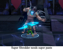 Shredder gets his revenge under traditional circumstances during the penultimate stage, and then returns for the final challenge as Super Shredder. He’s invincible for much of the match, and can only be damaged during “recharging” periods. It is the opinion of gogglebob.com that this is a terrible pattern for any videogame boss (who doesn’t like dodging forever?), but it is going to be allowed this time. Previous games had a “Super” Shredder that only had a bonus sword! At least he lives up to his name for once.