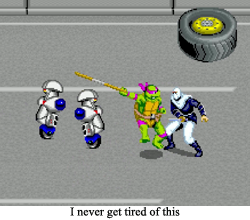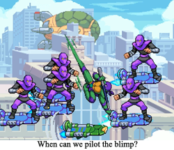 We have every variety of Foot Soldier available here. Some are color-coded, some just inexplicably have swords, and, every once in a while, one of those weirdos grabs a personal helicopter. They only have, like, ten of those, though, so they don’t last. Other opponents are limited to Roadkill Rodney, Mousers, and that one group of laser drones that are never seen again.