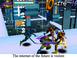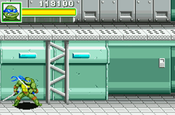 This is a weird mesh of Teenage Mutant Ninja Turtles: Fast Forward (2003 TMNT Season 6) and Teenage Mutant Ninja Turtles: Back to the Sewer (2003 TMNT Season 7). The first half of the game is “Shredder has been defeated, but something weird is happening”, and that “something weird” turns out to be an active time machine. This transports the turtles to the future, where they inexplicably immediately get new clothes (because the turtles are known for their outfit changes), and have to fight future versions of their present opponents. Note that since this plot is extremely thin, the turtles show absolutely zero curiosity about the future, and do not meet anyone but foes.