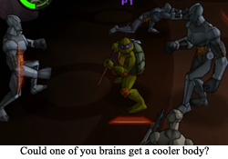 We are moving on to the 2003 Teenage Mutant Ninja Turtles series. That was the one that was a little more hardcore, with a Baxter Stockman that had some serious Ghost in a Machine issues. That gradually (offscreen) happens in this game!