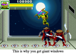 Aside from generic health pickups (each turtle has unique foodstuffs, so only Mikey gets pizza) This beat ‘em up takes more of a Double Dragon route, and there are multiple weapons that can be lifted from your opponents. Throwing rocks or shuriken feels cool, but is nabbing a bat an upgrade over a set of sai? And it is hard to tell what is goofier: Donny uncharacteristically holding a sword, or Leonardo trading his twin katana for a slightly larger, singular blade. Temporary swords are stronger somehow!