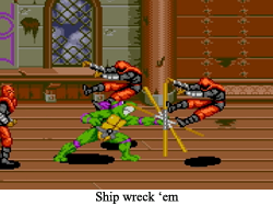 Every turtle gets their own vehicle, too! Leonardo steers the Sewer Slider through a rail shooter, Raph has a motorcycle race, and Donny gets the best with a 2-D shoot ‘em up via hang glider. Poor Mikey is stuck with a skateboarding stage that is way too reminiscent of Sonic the Hedgehog 2 to be any fun.
