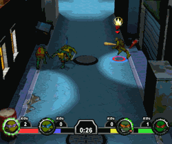 This is a 4-player fighter vaguely based on the simple principles of Smash Bros. Unfortunately, the gameplay is mostly ported from the 3-D beat ‘em ups of this era of turtles (see last week for more information), which does not translate to a good time for anybody. Those beat ‘em ups weren’t terrible! But they do not lend themselves to competitive multiplayer, either, as the gameplay of “keep hitting it” gets boring fast when you are having a (pizza?) party. Run up to your opponent, hit one of two attack buttons over and over, and call it a day. Fun for the whole family for like four minutes, and then you’re moving onto the game with Captain Falcon.