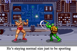 So we have a NES fighting game. It’s bad. It’s real bad. The four turtles are practically the same fighter with slightly different special moves (which, admittedly, makes this better than Mortal Kombat, which made the basics the same for its entire cast save Sonya). This means the fighters that are not turtles are the interesting ones, though we only have Casey Jones, Hothead, and Shredder. And Hothead is not available for mirror matches! Boo!