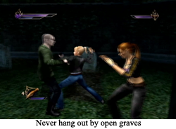 Further Connections: Buffy and Willow’s actual actresses did not feel like being voice actresses for this one (or they just had better contracts than everyone else in the cast). However, Giles, Xander, Spike, Faith, and Tara all have their attendant actors reprising their usual roles. And Tara is played by Amber Benson, who also appears in I Saw the TV Glow. See? It’s all coming together!- Story Time: Alright, Buffy-fans, be aware that this game takes place somewhere in about the middle of Season 5, and could possibly wedge itself into “real” continuity with a few minor blips (Spike notes in Season 7 that he never met Faith in her own body before; Faith and Spike interact randomly in this game). The concept here is that The First is responsible for their own Evil Dimension, and every random monster and evil doppelgänger is still alive there, so we have a fine excuse for a player to fight through Buffy’s greatest hits across the previous seasons. And since a healthy chunk of this game takes place in an alternate dimension, it doesn’t have to have any impact on the “real” Slayer-verse. On the other side of the coin, this was released shortly before the seventh season, and distinctly ends with a teaser for Season 7 (“From beneath you, it devours”), but also claims The First has been banished for a thousand years (and is vulnerable to a magic dagger that will never be seen again), despite the fact that they will be handy and menacing for the entirety of Season 7. In summary, Sunnydale is a land of contrasts.