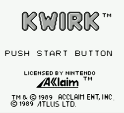 System: Kwirk is exclusively available for the Gameboy. Its original incarnation is Puzzle Boy, and that was available for the Famicom Disk System in Japan. There was apparently a PC Engine version, too, but that was also Japan-exclusive. Not even going to try to figure out what was going on there.- Number of players: Two-player competitive Kwirk is available with a link cable. One could argue the greatest advantage of 2-player Gameboy’ing is that you cannot snoop your opponent’s screen for puzzle solutions.