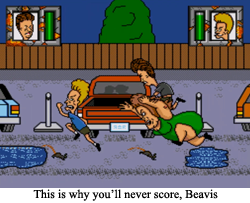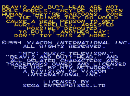 System: Insomuch as this article is focusing on any videogame at all, we are exclusively looking at the Sega Genesis version today. There were also games called “Beavis and Butt-Head” for the Super Nintendo, Game Gear, and Gameboy. All of those titles were unique, though. Beavis and Butt-Head in Virtual Stupidity is an entirely different (good) thing, too.- Number of Players: You can each control a protagonist with two controllers, but I assure you that no extra fun will be had with such a setup. I am speaking from experience.