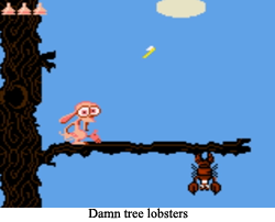 • Skip Ahead: A save battery would be unheard of on a cartridge such as this, but there is a password system in place so you can pick up where you left off in the adventure. And said passwords are relayed between levels by Ren & Stimpy being attacked by various maladies, so codes are “ZOWCHH”, “AURGHH”, or alike. Good to see Ren’s full vocabulary on display.
