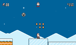 What can you collect? Like Mario, Santa needs coins for unexplained reasons, and said coins will eventually buy more lives. Additionally, you have a stocking full of coal as a powerup, which allows Santa to toss coal in a manner not unlike a certain plumber distributes fireballs. Finally, we have a candy cane that is just kind of floaty, and miraculously does not immediately recall any Mario powers.