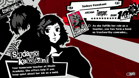 She was already briefly featured in this article, but let’s examine Sadayo Kawakami for a moment. Kawakami is a language teacher at Joker’s school, and also his homeroom teacher. There are multiple teachers and administrators floating around the plot of Persona 5, but thanks to her early introduction and presentation, Kawakami is the one that could most easily be described as “your teacher”. She initially is wary of Joker, but comes around to him after the revelations following the outing of a separate, malevolent teacher/coach. From that point on, she is generally supportive.