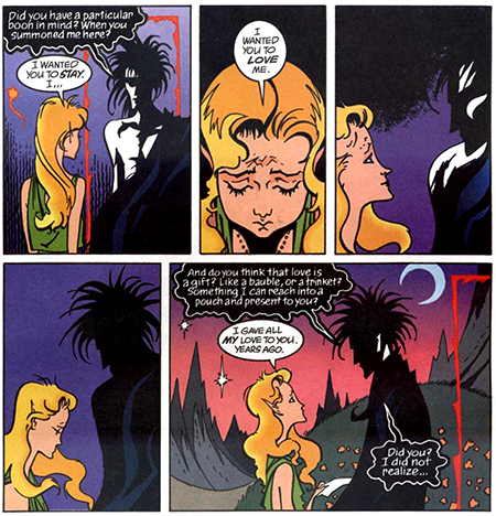 She loves Dream of the Endless! And that’s the main dude in this story! “As deeply and as well as any man was loved by a woman.” Why, she must have been central to everything! This was a love between two immortal beings, and, in a story where ol’ Dream is continually doing things like venturing to the very depths of Hell for his paramours. Their relationship must have been…