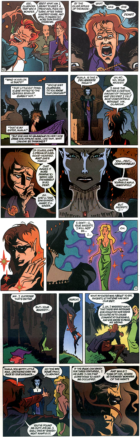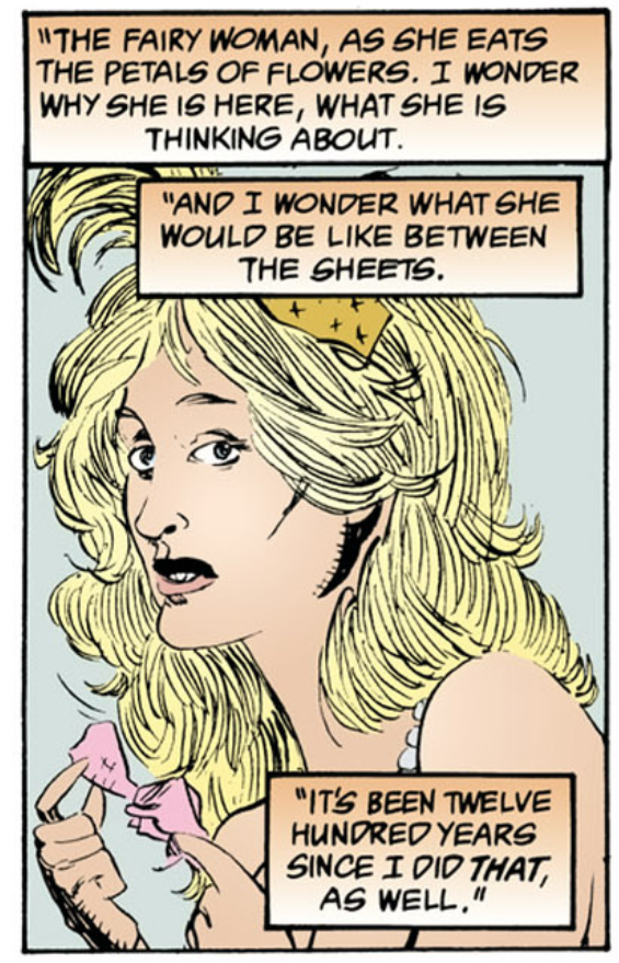 But was Dream kind? Well, the first thing he did upon “owning” Nuala was tear off her glamour. And, as we’ve established, a fairy without a glamour is treated like they are essentially naked. Nuala’s brother Cluracan is never seen without his glamour despite appearing multiple times and starring in one issue (and guesting for the rest of that arc). In fact, no other fairy in The Sandman is ever seen without their glamour in 75 issues. It’s just Nuala, who Dream stripped (magically) naked, and then asked to parade around the castle. Because he said so.