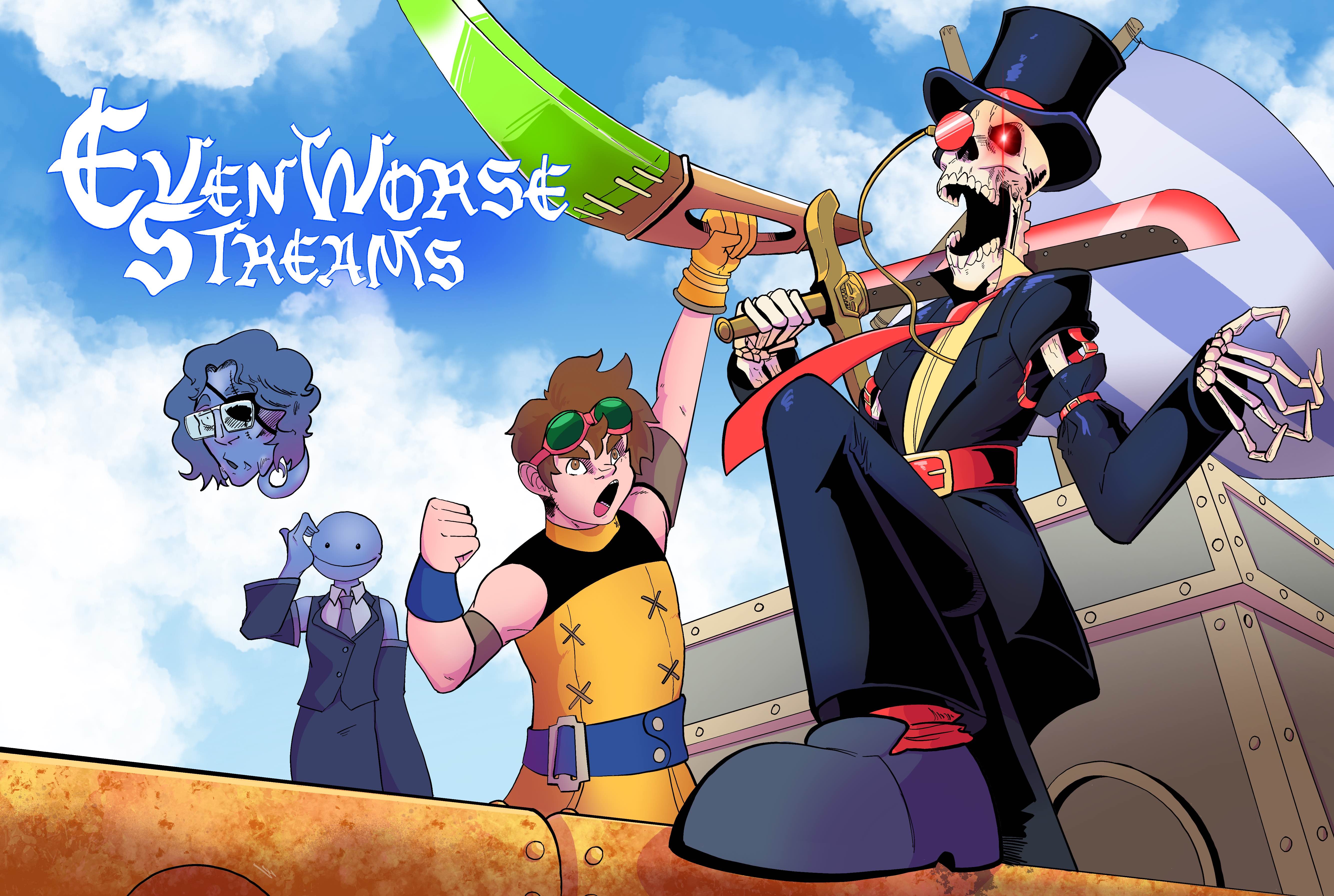 I think the results suit Even Worse Streams pretty well though, the final piece has the energy of an enthusiastic bootleg toy package in a way I really like. “Come check out Even Worse Streams’ Guys of Beatcadia! We have” (checks note on hand), “… Veyes? Our shounen protag is bones now and fanboymaster’s having some issues but we promise it’s just as good as the original blue rogues!”